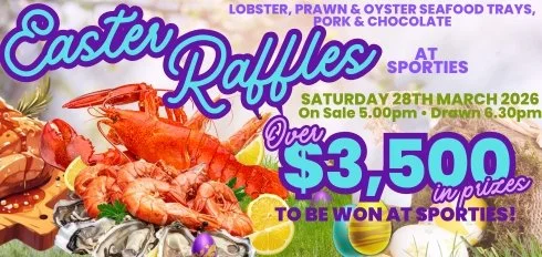 Easter Raffles at Sporties Tuncurry 2026 Saturday 28 March 2026 5:30 pm 6:30 pm 17:30 18:30 Sporties Tuncurry 65 Beach Street Tuncurry NSW 2428 Australia (map) Google Calendar ICS 🐇 Easter Raffles at Sporties Tuncurry!📌 Saturday 28th March 2026🕗 On Sale 5.00pm | Drawn 6.30pm🥚️ OVER $3,500 in Lobster, Prawns, Oysters & Pork to be won!